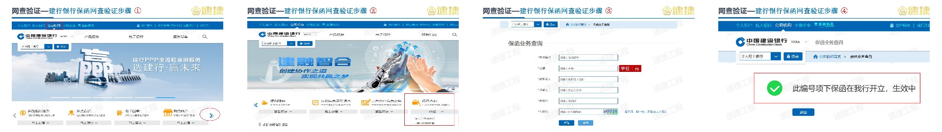 鑒別保函真?zhèn)?/span>常見有5種方法①落款電話驗(yàn)證②官網(wǎng)/專屬網(wǎng)站查詢驗(yàn)證③人民銀行大額支付系統(tǒng)驗(yàn)證④公證處驗(yàn)證⑤保函專屬二維碼驗(yàn)證 方法一 落款電話驗(yàn)證: 無論是銀行開出保函還是擔(dān)保公司自已出具的保函,保函都會(huì)有落款電話,可以通過致電落款電話,通過保函編號(hào)或者保函關(guān)鍵信息(如:被保證人、受益人、工程名稱、擔(dān)保金額、擔(dān)保截止日期等)進(jìn)行核對(duì)。注意:由于電話核對(duì)的是保函信息,銀行方或者擔(dān)保公司由于保函原件未在現(xiàn)場(chǎng),都只能提供保函信息是否正確、是否是自身銀行或擔(dān)保公司開具,而無法辯認(rèn)保函原件的真?zhèn)涡浴?/span> 方法二 官網(wǎng)/專屬網(wǎng)站查詢驗(yàn): 建行銀行保函網(wǎng)驗(yàn)證步驟: 第一步:進(jìn)入建行官網(wǎng)“https://www.ccb.com”—“公司機(jī)構(gòu)首頁(yè)”,并將如圖1紅色圓圈處的向右拉開的第二屏菜單。 第二步:向右拉開的菜單拉開后就會(huì)見到如圖2的頁(yè)面,這就是第二屏的頁(yè)面,最右邊的就是“保函查詢”菜單,向下打開,就會(huì)看到“境內(nèi)保函查詢”。 第三步:進(jìn)入“境內(nèi)保函查詢”,就會(huì)出現(xiàn)保函查詢頁(yè)面,需分別輸入如圖3的保函編號(hào)、金額、被保證人、受益人、查詢碼(就是保函原件右上角上的查詢碼)、附加碼,然后點(diǎn)擊查詢。 第四步:只要第三步操作正確,就會(huì)顯示“此編號(hào)項(xiàng)下保函在我行開立,生效中”的信息。這句話的意思是你輸入的這個(gè)保函編號(hào)下的保函是建行開立,而且在保障期。 大家要注意一點(diǎn),這里沒有提及這個(gè)保函真?zhèn)蔚淖盅郏@是因?yàn)楸:ㄐ锌床坏剑詻]有提及這一點(diǎn)。